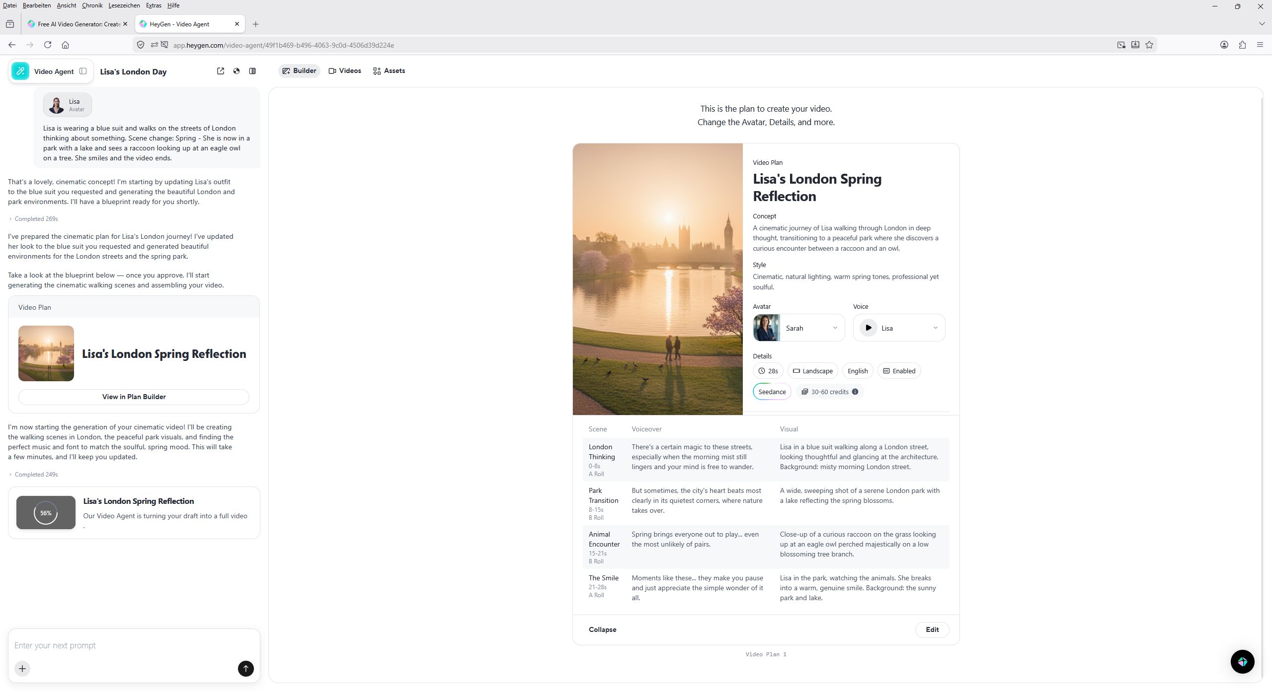 HeyGen ist rein auf Videos spezialisiert „At HeyGen, our mission revolves around empowering individuals through accessible AI video generation“ und verfolgt mit seinem Video Agent den Anspruch „Not a tool. Not a copilot. It’s a creative agent doing the work for you.“ Zentral ist die Möglichkeit, einen (z. B. auch selbst erstellten) Sprecher-Avatar zu wählen mit Voiceover für die einzelnen Szenen – in Kombination mit der Aktivierung des KI-Videogenerierungsmodells „Seedance 2.0“ konnte mein bisheriger eigener Foto-Avatar jedoch nicht genutzt werden.