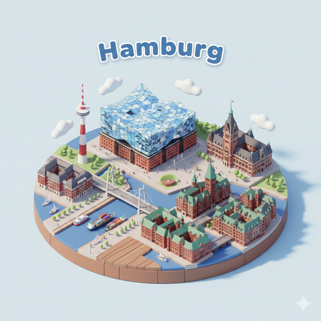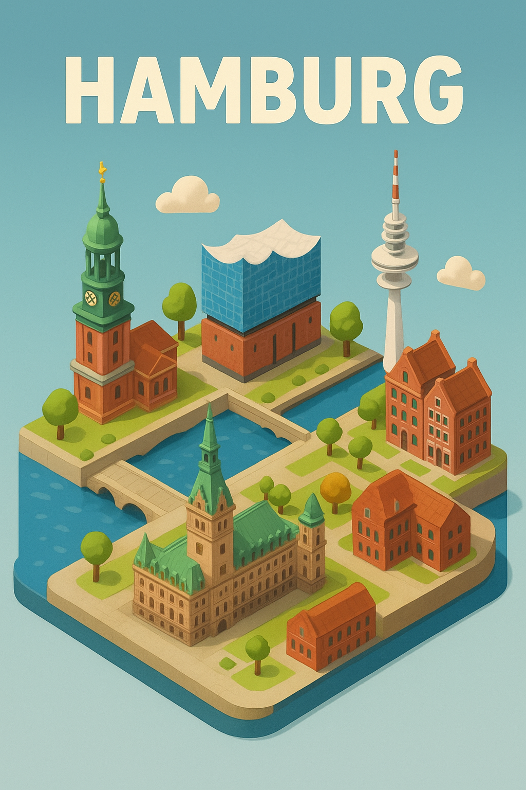 Present a clear, 45° top-down isometric miniature 3D cartoon scene of Hamburg, featuring its most iconic landmarks and architectural elements. At the top-center, place the title “Hamburg” in large bold text.